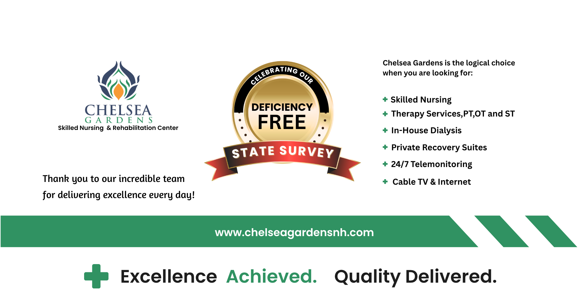 " From our employees to our facility and our practices, we strive to excel in all areas so you can improve your quality of life and environment for the duration of your stay. "